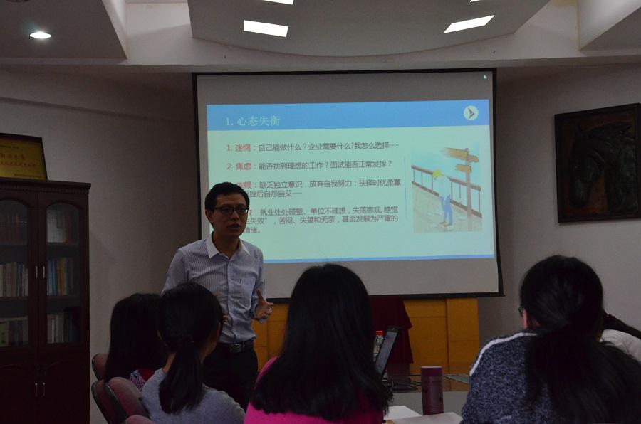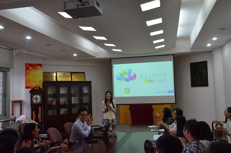 在热烈的掌声中,本次心理讲座正式开始。首先介绍的是就业心理问题的六大表现,比如大家常见的心态失衡和认知失调。闫老师并结合大学生活,和大家一起探讨了研究生在求职时应具备的心理素质,其幽默的性格和风趣的语言赢得了大家的阵阵掌声。