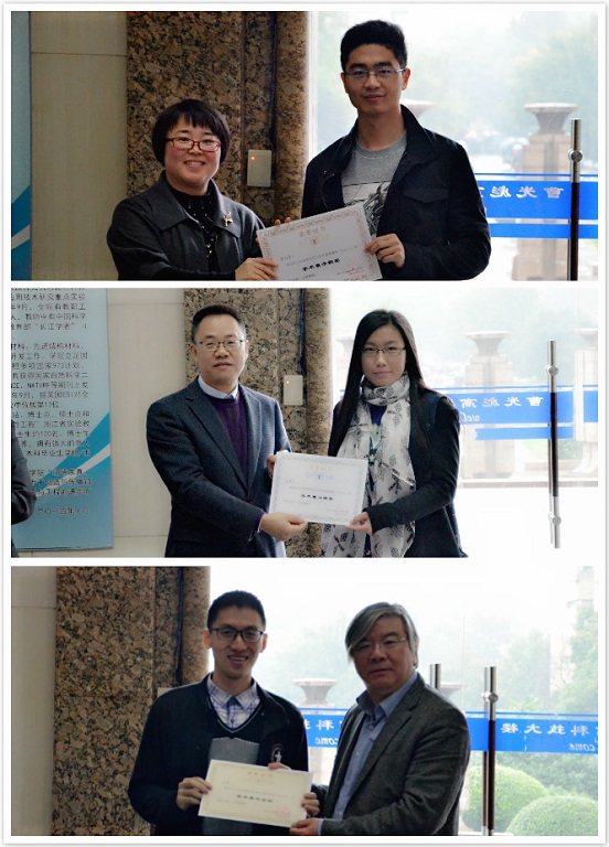 展出结束后,通过专家评委打分(70%)与学生投票(30%)相结合,最终评选出10名“学术展示金奖”,10名“学术展示银奖”和12名“学术展示铜奖”;其中金奖者将获得800元奖金及证书以资鼓励刘艳辉书记、吴勇军副院长韩高荣院长分别铜、银、金奖获奖者颁发证书并合影留念