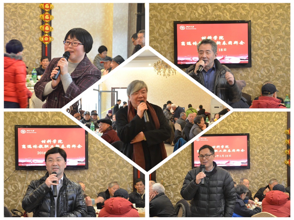 团拜会由学院党委书记刘艳辉老师主持。首先,韩高荣院长代表学院党政班子汇报了2015年学院在学科建设、人才培养、教育教学、成果转化、师资队伍等方面取得的辉煌成绩,重点介绍了成果转化和学科发展;并对新一年的工作进行了展望,对为学院发展做出辛勤付出的老前辈、老同事们表示衷心的感谢,祝愿各位老前辈、老同事新春快乐,生活快乐;希冀各位老教师一如既往的关心和支持学院的发展壮大,为学院的发展继续献计献策。接着,学院工会主席杜丕一教授代表工会祝愿全体离退休老师身体健康、阖家幸福!学院副院长陈立新教授和党委副书记皮孝东教授给离退休老师分别送上新年的问候及诚挚的新春祝福!随后,九十六岁高龄的首任系主任王启东先生祝福学院在学科建设中所取得的丰硕成果,并祝愿在新的一年中有更大的发展,同时祝愿离退休老师们新年快乐、身体健康、万事如意!