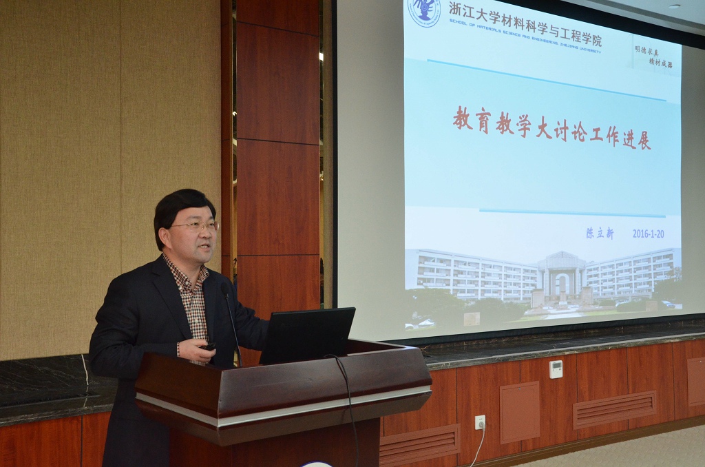 材料学院分管教学副院长陈立新老师汇报了学院教育教学大讨论进展。陈老师向大家详细介绍了学院关于教育教学大讨论的整体讨论情况和材料专业综合改革措施,并从教育理念、培养目标等多个角度向大家阐述了新培养方案的改革情况。
