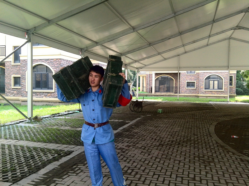 指导员还让大家学习如何扛弹药箱,以及如何挑扁担。