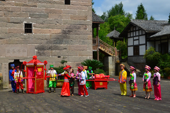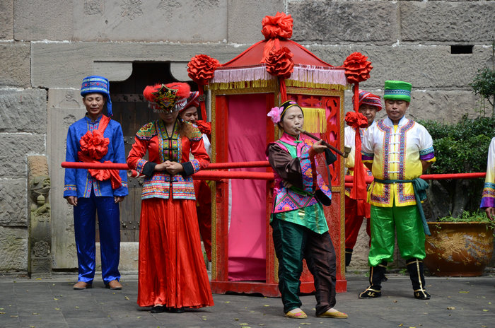 我们所观赏的表演是由秦文洲老先生所改编的土家婚俗情景剧,其中以哭嫁为主体,结合了�儿调、玩牛、斗锣和断头锣鼓等多种非遗的形式。目前作品的长度约为40分钟,包括“哭嫁”、“轿夫号子”、“拜堂成亲”以及“闹房歌”等内容。表演团的30多名演员全部为石柱当地农民,原汁原味的原生态表演和土得掉渣的方言俚语、欢乐祥和的热闹氛围是节目的最大特色和亮点。