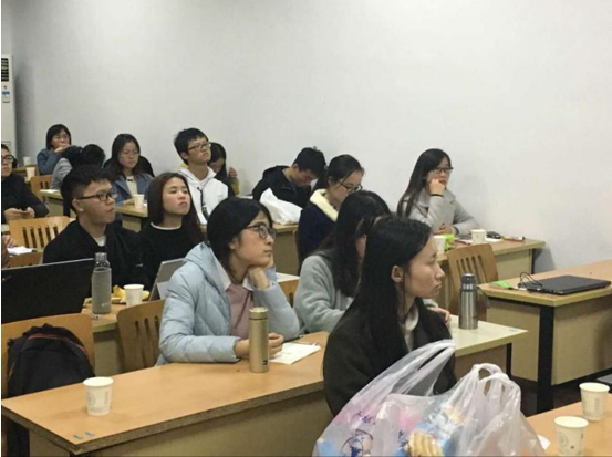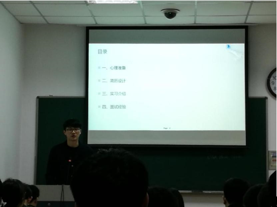 首先,楼煊宇学长分享了自己找工作的心得,以及一些大公司笔试和面试的内容。他告诉同学们互联网公司的秋招更早开始,以及有条件的话可以利用公司内部员工的内推名额。同学们都听得非常认真。