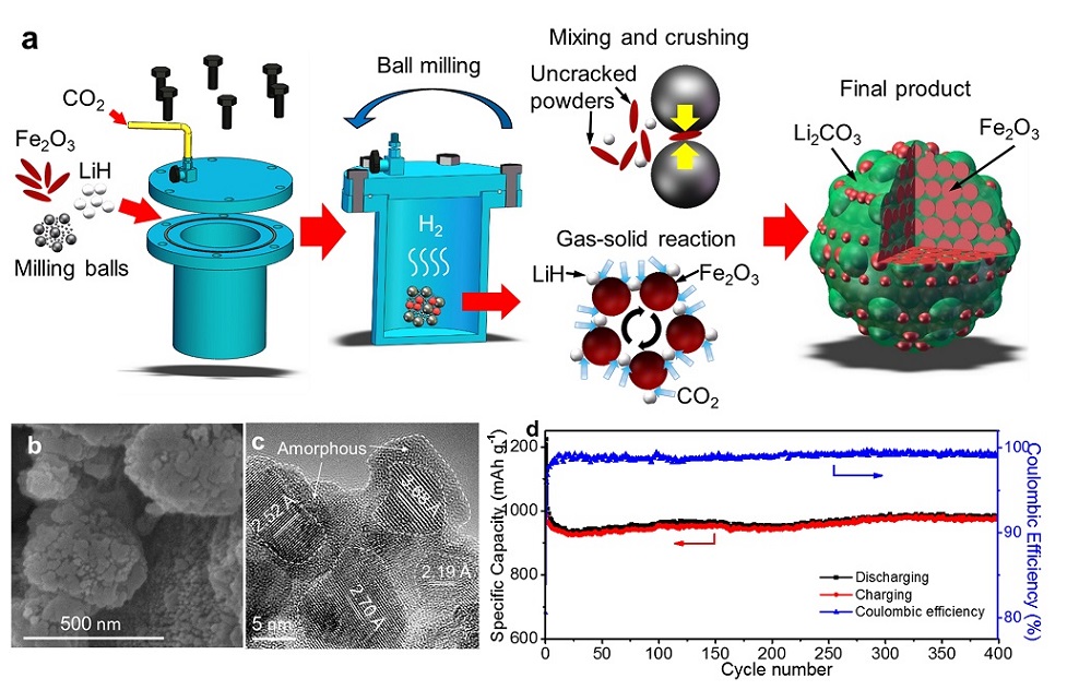 过渡金属氧化物作为锂离子电池负极材料具有储量丰富、成本低廉、环境友好、安全性能高和抗腐蚀能力强等优点,近年来备受人们的关注,但其较差的循环稳定性和低的库伦效率阻碍了实际应用。纳米化和碳复合是改善过渡金属氧化物负极材料的有效途径,但这些方法分别存在制备困难、体积储能密度下降等缺点,不利于大规模商业化应用。针对这些问题,浙江大学材料学院金属材料研究所、硅材料国家重点实验室、浙江省电池新材料与应用技术研究重点实验室刘永锋教授和潘洪革教授与浙江大学电镜中心田鹤研究员、华南理工大学材料学院朱敏教授合作,通过在CO2气氛下球磨LiH和Fe2O3的混合物,利用Fe2O3、LiH与CO2在机械化学力作用下的氧化还原反应,成功在纳米晶Fe2O3(10 nm)表面共形包覆了一层1-3nm的Li2CO3层;同时,由于球磨过程重复的破碎和冷焊作用,共形包覆的Fe2O3进一步团聚为亚微米颗粒(400-800 nm),这种共形包覆和分级结构共存的纳米晶Fe2O3具有良好的循环稳定性能和高倍率放电性能,其在100 mA/g的放电电流密度下,400个循环后的容量保持在975 mAh/g;在3000 mA/g的放电电流密度下,其放电容量达537 mAh/g,明显高于未包覆的纳米Fe2O3颗粒(311 mAh/g)。该分级、共形包覆技术具有制备过程简单,可控性好,效率高等优点,更重要的是,其可以扩展到NiO等其它过渡金属氧化物负极材料上,呈现出一定的普适性。这一研究成果为发展高容量、长寿命型过渡金属氧化物锂离子电池负极材料奠定了基础。