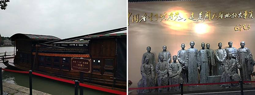 “七月南湖水涟涟,烟雨楼台雨如烟,荷花深处摇来一只船,南湖的船啊,党的摇篮,历史将从你这里揭开新篇”。1921年7月23日,中国共产党第一次全国代表大会在上海秘密召开。会议临近结束,遭法租界巡捕的袭扰而被迫停会,根据上海代表李达的夫人王会悟的建议,8月1日会议转移到嘉兴南湖的一条游船上继续举行。在这条红船上,会议通过了第一个《中国共产党章程》,宣告了中国共产党的诞生,从此中国革命翻开了新的一页”。党员们参观了中共一大的会址--停靠在南湖岸边的红船。