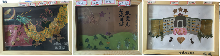 “仰天长啸待时日,巨龙腾飞平地起”,作品“中国梦”寓意在党的正确领导下,全体中华儿女共同努力实现中国梦,实现中华民族伟大复兴,让中国这只巨龙再次腾飞。作品“工农团结跟党走”以松树代表林业,水稻代表种植业,大家沐浴着党和国家的光辉,茁长成长,从心底开出花来,齐心协力跟党走。作品“科技之光”寓意全体材料学院的师生发自内心的歌颂党,拥护党的“三个代表”重要思想。
