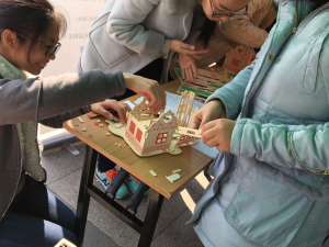 比赛现场,各组竞争激烈,也有部分组偷偷前往其他小组取经,为自己组的作品提供更多的搭建和设计思路。上下飞舞的手指在木板之间穿梭,搭建起结构严谨的小木屋;彩色的笔尖在木板上轻轻留下印记,是灵感在设计上的舞动。