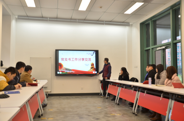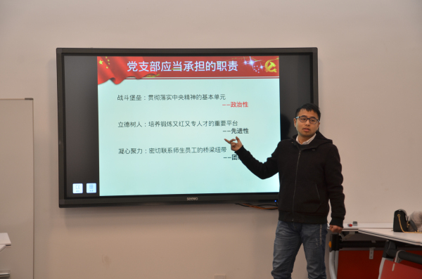 党支部是学院党团建设的桥梁与纽带,杨老师总结学院党团工作后,紧接着由三位工作优秀的支部书记作了经验分享。无机三支部党支书张骏以《全面贯彻从严治党》为主题,从四个全面回归到为人民服务的初心。立足于支部存在的具体问题,对症下药加强支委建设,创新支部活动,开创支部微信公众号,在动态的更新完善中加强静态的活力传承。