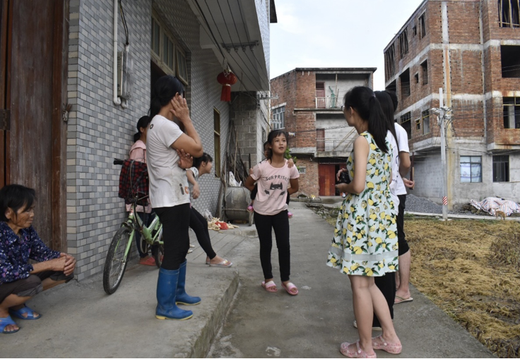 经过30多分钟,我们从果地村来到了今天家访小朋友所在的新村。即便处于假期时间,在狭窄的小路上,我们能见到的也大多是步履蹒跚的老人与一些还在牙牙学语的小孩子们,少有的几位大人和年龄稍大的孩子们都加入了收割稻谷的队伍里。