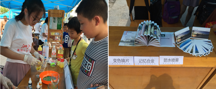 在校长一行到来之前,材料学院今天科学实验比昨日更加火热,同时我们团队还添加了先进的金属材料展示,再一次博得市民眼球,吸引了大批市民带着孩子围观,黄发垂髫均乐在其中,队员们用朴实而深刻的科普语言更进一步揭示了材料背后之科学原理。