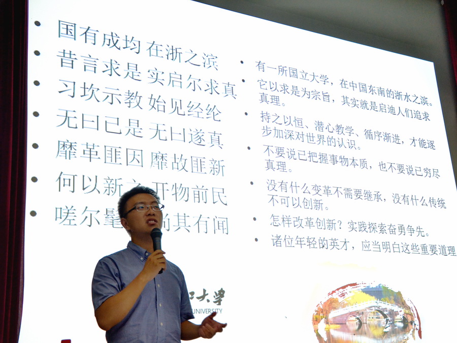 校歌教唱环节由高分子系经验丰富的陈泽星老师指导。在陈老师的带领下,几遍练习之后,同学们已经唱得有模有样了。虽然学习的时间还不长,但是相信同学们已经体会到了校歌中蕴含着的精神底蕴和作为一个浙大学子的自豪。
