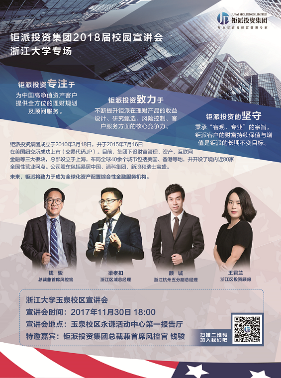 钜派投资集团2018年校园宣讲会浙江大学专场(11月30日18点永谦第一报告厅)