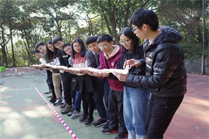 暖场活动结束后,同学们都一扫疲惫。素拓师将大家分为3组,在10分钟的时间里完成队伍内部建设,用纸笔画出队伍标志、名称、口号,选出队长与队长“秘书”,并向所有人展示队伍风采。在同学们的欢声笑语中,“bangbangbang队”、“有II队”、“超人队”都完成了队伍展示。之后,三组的任务是“五分钟挑战”,有七个团队游戏,素拓师一一跟大家解释了游戏的规则,要求每组经过30分钟的练习后,在5分钟以内完成所有七个挑战。