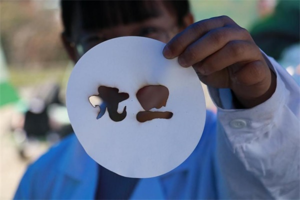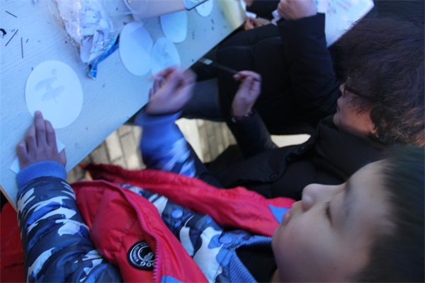 火龙烧字由硝酸钾受热分解的原理设计而成。现场工作人员配好溶液,参与者在滤纸上画上自己想要的图案或者是写字,再由火星引燃,烧出出画的图案。在工作人员的仔细地教导和耐心地帮助下,参与的大家都烧出了很多有趣的图案。有的烧出了表情包,其乐无穷;有的则烧出了一颗爱心,充分烂漫;还有的烧出了自己的潇洒签名,很是酷炫……活动反响热烈,直到2017年的最后一个黄昏来临,摊位上还十分欢快热闹。