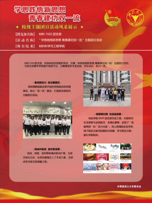 学思践悟新思想 青春建功双一流”浙江大学2018年校级十佳主题团日“展示海报”评选活动开始啦~快来为材料学院材料1502团支部投票吧!