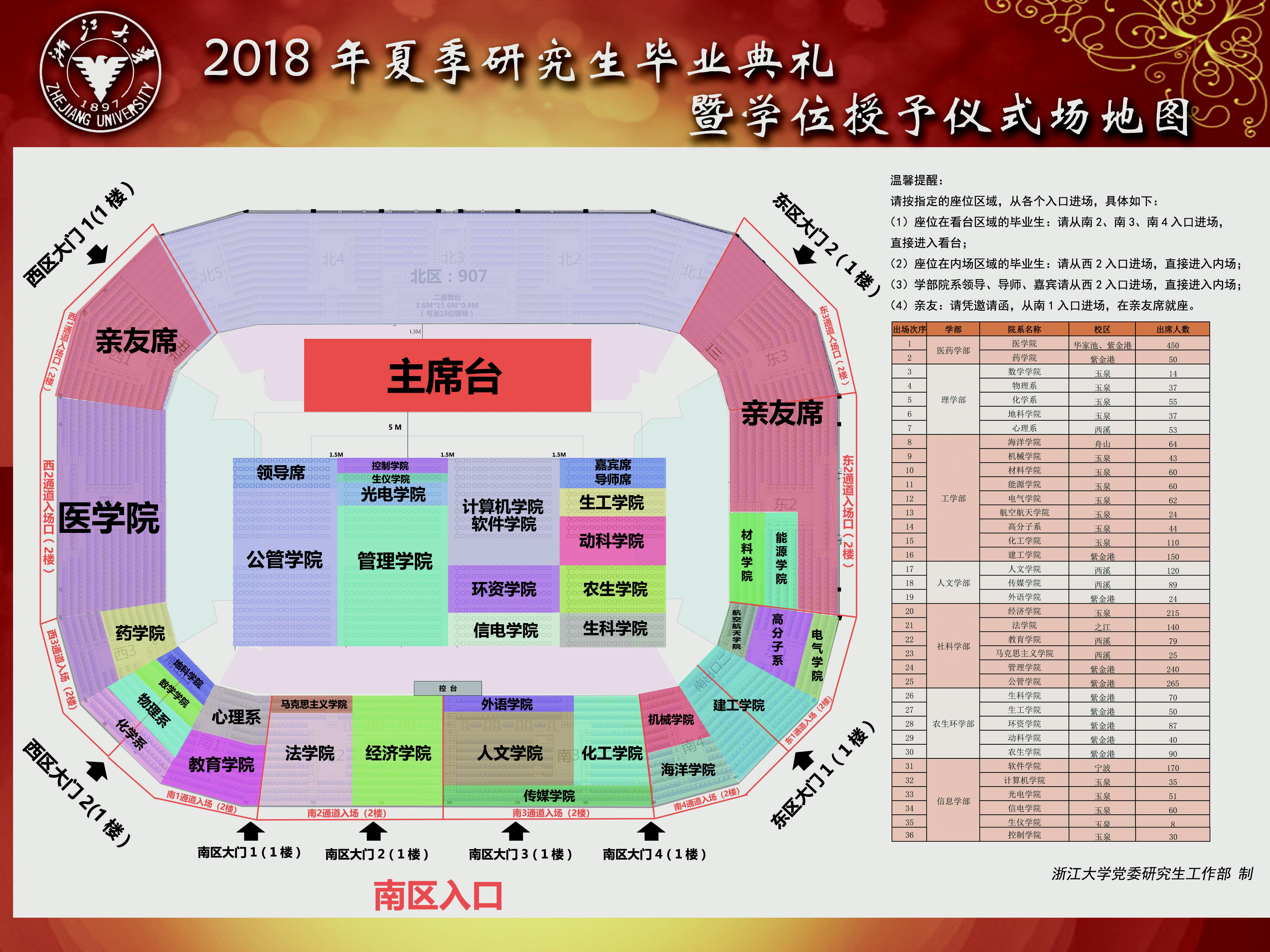 4. 各学院(系)领队老师在6月26日下午2:30到紫金港校区体育馆参加筹备会,并现场熟悉所在学院(系)的场地、通道以及毕业典礼和学位授予仪式的相关程序。