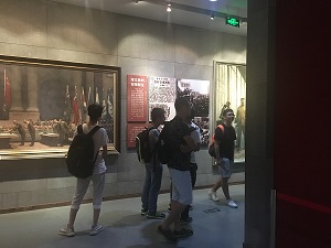 钟山风雨起苍黄,百万雄师过大江。今天下午我们来到了渡江胜利纪念馆。在纪念馆前,我们看到了当年指挥渡江战役的总前委成员邓小平、刘伯承。陈毅、栗裕、谭震林五位老革命家的雕像。走入馆内,各种文物照片应接不暇,真实地向我们展示了渡江战役各阶段的具体状况。我们看到了被战火硝烟包围的携带重要文件的公文包,看到了在壕沟中嘶鸣的机枪,看到了年轻的战士出征前写下的家书,看到了风沙沉沉的军服……