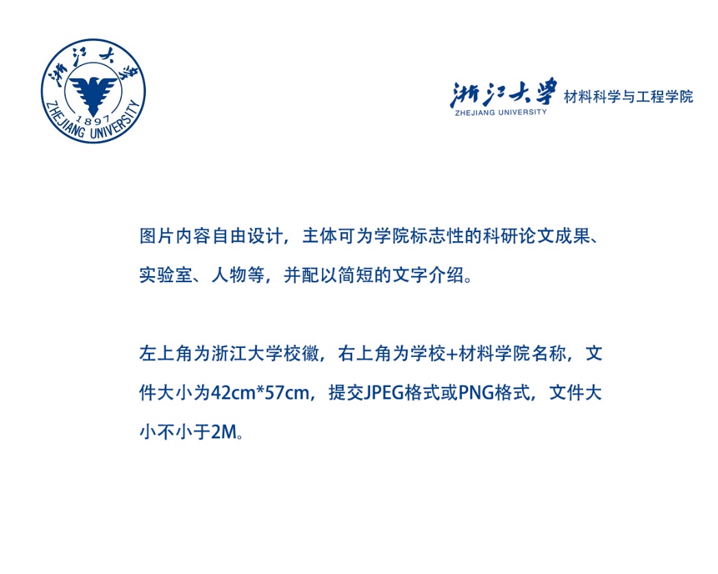 图片的格式要求:左上角为浙江大学校徽,右上角为学校+材料学院名称,标准格式均可在“浙江大学官方网站-校情总览-学校标识”中下载。