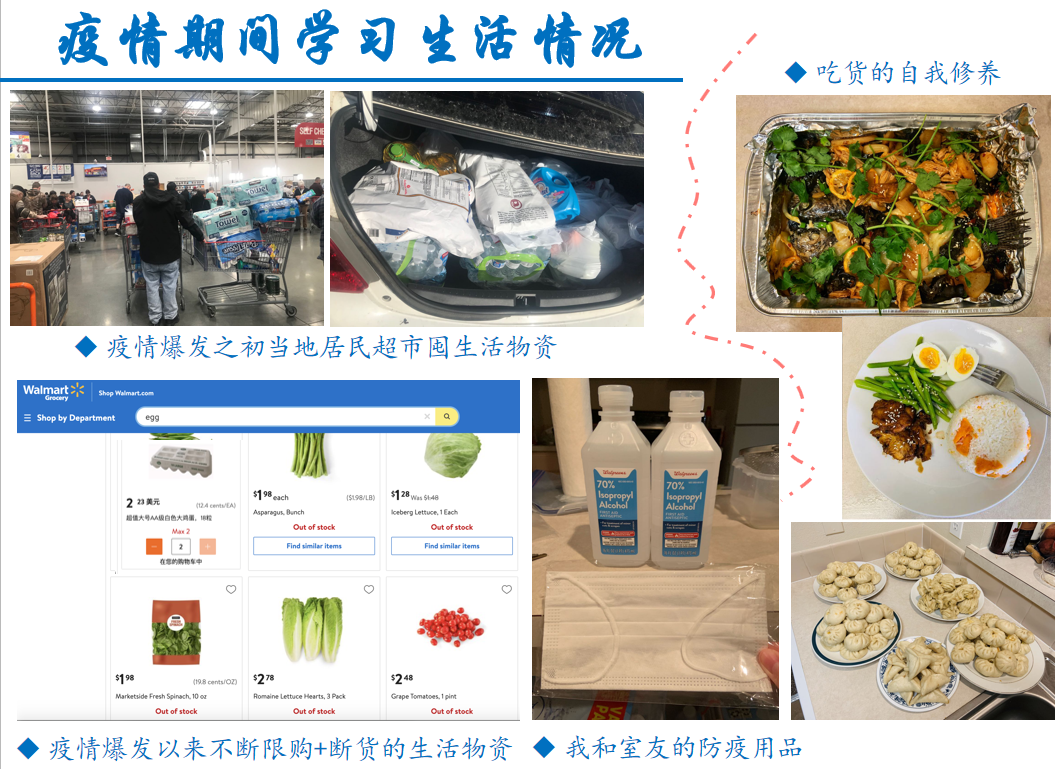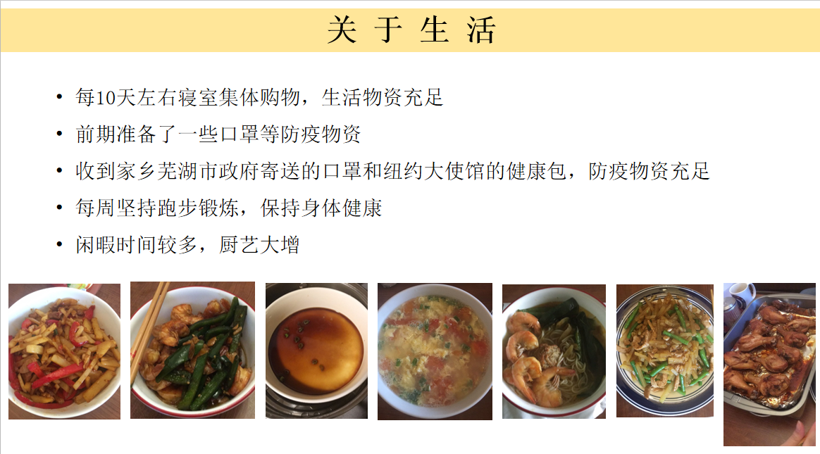 座谈会第三个环节是各位学子的近况分享。在海外的每位同学精心准备了图文,分享留学所在地区的基本情况、学校对应的政策,以及停课宅家后的生活安排。很多同学都收到了健康战疫爱心包,感谢包括政府和学校各方对海外学子的关爱,感叹祖国的强大和暖心。同时表示要合理科学地安排这段时间,不让疫情延误科研,待学有所成,平安归来。以下为分享内容的部分节选: