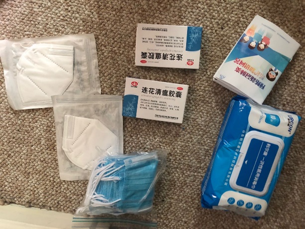 (图为罗雪分享的在法国收到的大使馆健康包)