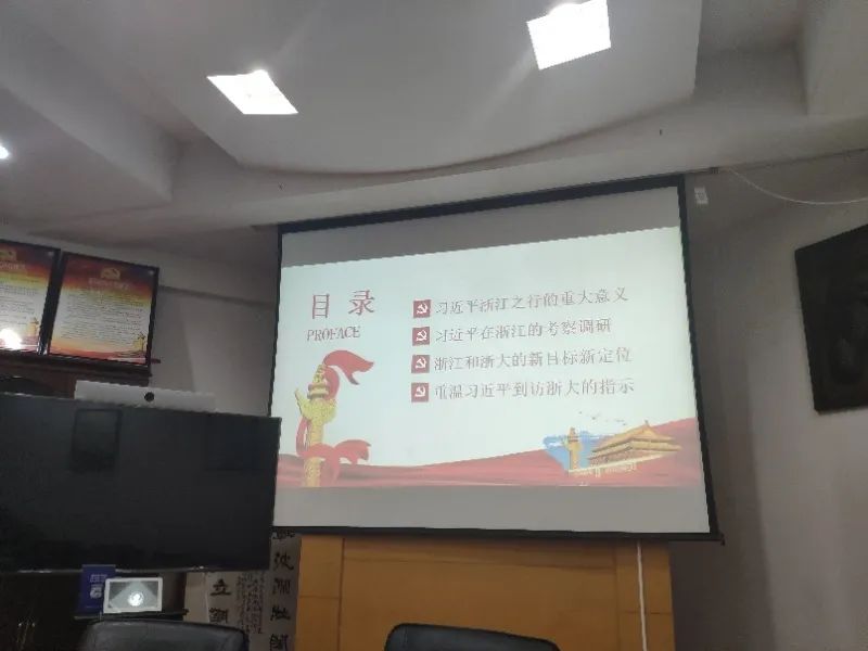 会议议程第三项由刘群获同志带领我们深入学习了关于“干在实处,走在前列,勇立潮头”的习近平总书记在浙江考察时的重要讲话精神。刘群获同志从习近平浙江之行的重大意义,习近平在浙江的考察调研,浙江和浙大的新目标新定位以及重温习近平到访浙大的指示四个方面展开来讲,让我们感受到习近平总书记对于浙江发展的重视和那一抹浓浓的浙大情。