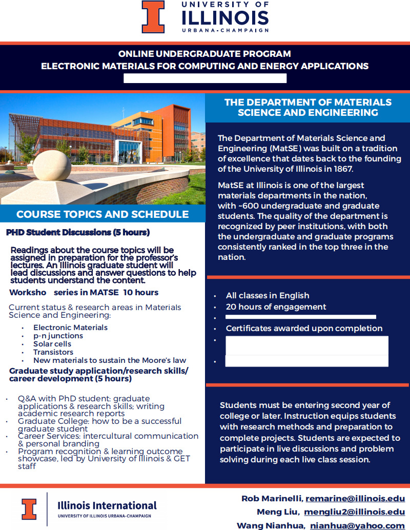 9月底 | Electronic Materials for Computing and Energy Applications(UIUC)《电子材料:计算与能源应用》 项目具体信息: | 按照学校、 学院政策进行资助,后续仍可按照规定参加本科生出国(境)交流并得到该经费资助。 | 暂未认定第四课堂学分的2017级、2018级学生必须参加该课程。其他年级感兴趣学生也欢迎报名参与(含已获得第四课堂学分的学生)。 |