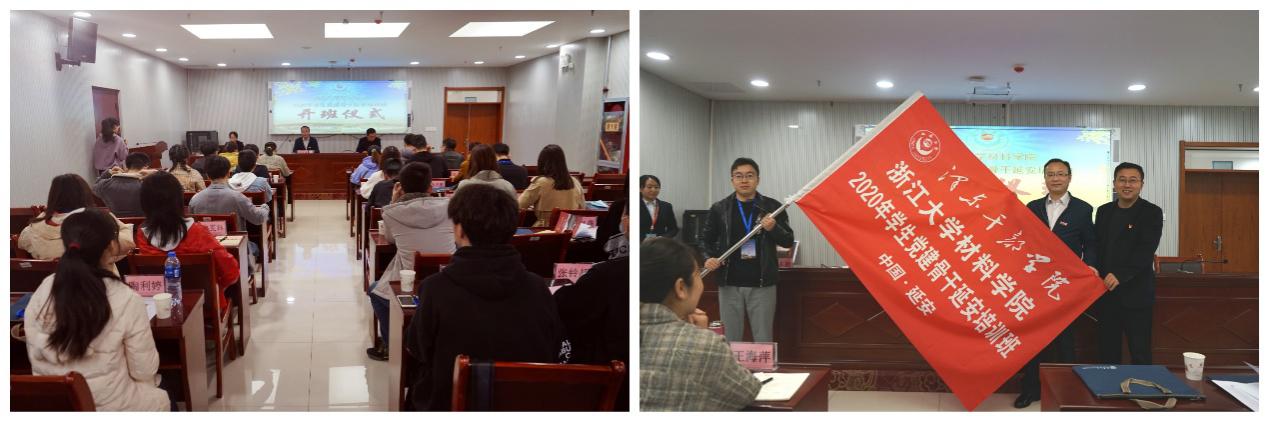1016日上午,在延安大学泽东干部学院第二会议室举办了开班仪式。延安干部学院副院长杜宪增向培训班致欢迎辞,并简要介绍了延安大学、延安大学泽东干部学院的基本情况及延安的革命历史。浙江大学材料学院党委副书记张士良对全体学员进行了动员讲话,讲解了本次培训的目的并提出了培训期间的学习和纪律要求。仪式最后,培训班班长王宣程接过杜宪增副院长授予的班旗,标志着本次培训正式拉开帷幕。
