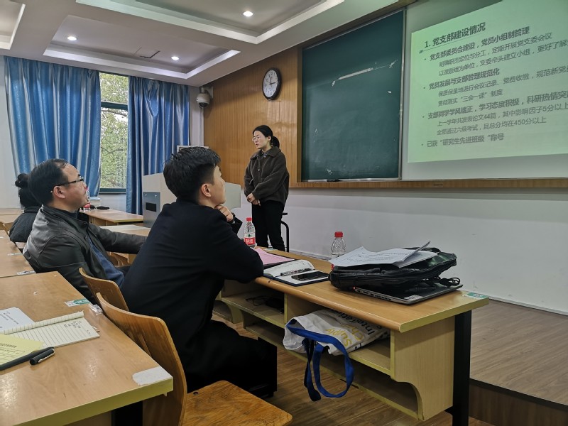 会上研究生和本科生共17个党支部书记先后述职,各支部书记分别围绕教育党员有力、管理党员有力、监督党员有力、组织学生有力、宣传学生有力、凝聚学生有力、服务学生有力等七个方面对党支部所开展的工作进行了汇总介绍。各支部积极落实“三会一课”,提升支部组织力,并通过开展各类创新型党建活动,如设立图书角、学习传统文化及开展体育锻炼等,努力调动党员的积极性。在疫情期间,各支部积极开展线上活动,分享身边的抗疫故事。同时大家还提出了支部建设中存在的一些问题,如部分党员参与度较低、支部间互动较弱等,并通过分析原因提出了具体的改善措施。最后大家根据本支部的具体情况展示了支部今后的工作思路。述职完毕后,全体与会人员对现场述职的支部书记进行了评议打分。