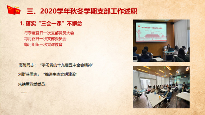 会议第三项为支部书记刘群获同志就无机三支部2020-2021学年秋冬学期的工作作述职汇报。刘群获同志首先介绍了支部的基本情况,随后总结了支部委员会的工作,对取得的工作成果进行了充分肯定,也对部分工作存在的不足之处进行了深刻反思并提出针对性解决措施,相信无机三支部定会在大家的共同建设下蒸蒸日上,蓬勃发展!
