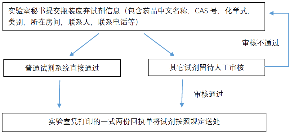 瓶装废弃试剂是指实验使用后多余的、失效(包括标签丢失、模糊)的试剂。此类试剂一般由原装试剂瓶盛装,并无法通过预处理作为废液清运处置,可通过“瓶装废弃试剂处置申报系统”申请清运处置。