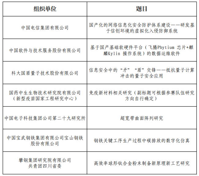 经过前期准备后,团中央组委会面向中央部委、地方政府、行业协会、企事业单位等广泛征集选题。经资格审查、专家评审,最后遴选出7个前沿性、应用性和可赛性较强的选题!选题如下图,具体赛事要求以及赛事奖励和保障见附件1。
