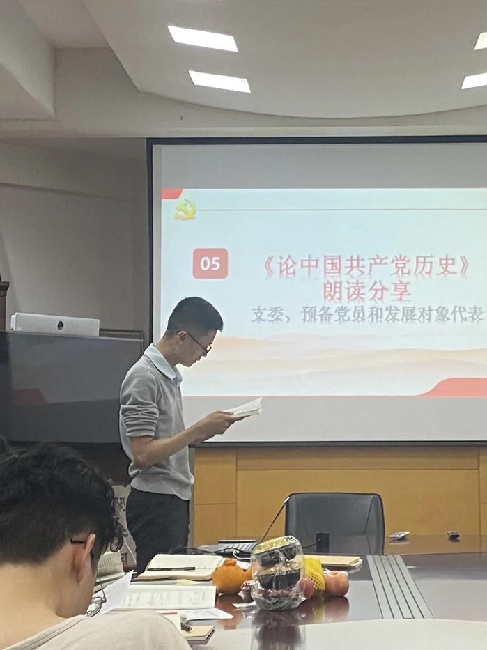 会议最后一部分是“读党史、悟新知”党史学习教育,依次由五位正式党员代表、一位预备党员代表与一位发展对象代表轮流朗读《论中国共产党历史》这本书中触动他们心弦的部分内容。在建党百年的这个关键时期,大家饱含感情的朗读声令在场的同学陷入了深深的思考。读史是度过去,更是明现在、见未来,通过本次党史学习教育,大家不仅领会到了党的历史与使命,更对党对青年的要求与殷切期望有了新的体会。