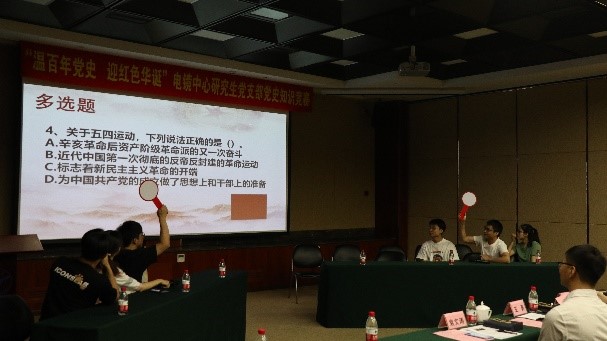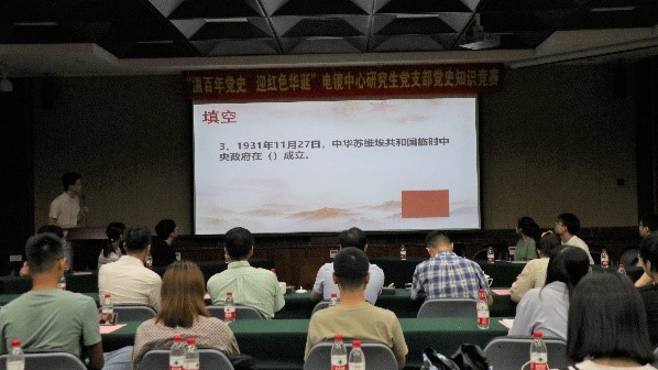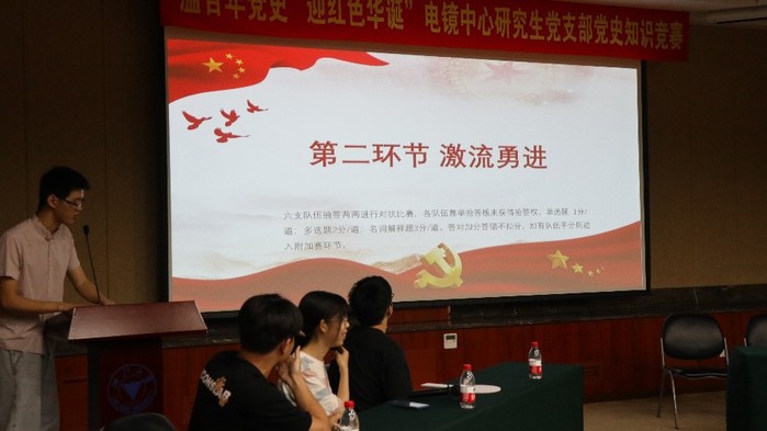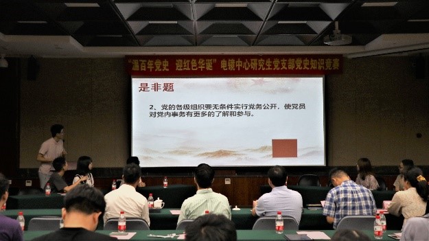 为巩固支部的党史学习成果,迎接党的百年红色华诞,切实引导支部党员学史明理、学史增信、学史崇德、学史励行,2021年6月29日上午9:00,电镜中心研究生研究生党支部,在邵逸夫科技馆212隆重举办“温百年党史,迎红色华诞”党史知识竞赛,学院党委副书记张士良,党委秘书王海萍,电镜中心主任王勇教授,电镜中心德育导师王江伟研究员,电镜中心班主任袁文涛老师出席本次会议并担任评委,支部全体党员参加了本次活动,本次比赛由支部副书记林宇铖主持。