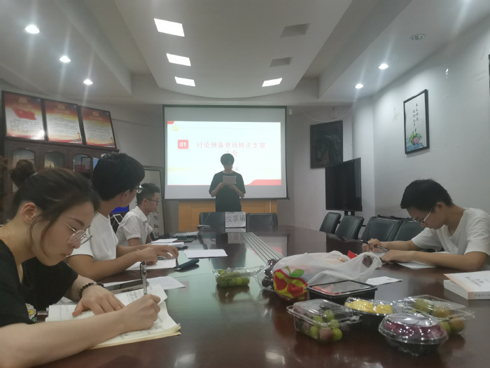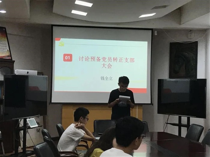 问渠那得清如许,唯有源头活水来,党组织能够一直保持先进性和活力的重要原因之一便是不断吸纳优秀的人才进入党组织。会议第一项为预备党员转正大会,被接收人为钱全立同志和张舒云同志,大会由支部书记刘群获主持。钱全立同志因毕业离校缘故,其转正大会提前到7月8日。会上应到人数33人,实到人数20人,其中正式党员15人,预备党员5人,13人请假。
