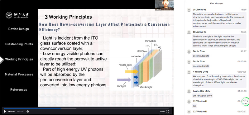 材料学院18级 鲍浙安   本次线上学习交流活动,虽然时间并不是很长,但是在这有限的时间里面我学习到了很多在国内课堂里学习不到的知识以及增加了一些新的上课体验。交流活动围绕的主题是关于太阳能电池与电化学等能源应用材料展开。随着社会的不断发展,粗放型的传统能源所带来的环境污染问题越来越严重,同时传统能源效率低下的问题一直得不到有效解决。在这样的背景之下,新能源材料作为一种高效的清洁能源收集,转化中介,对于缓和经济发展与环境之间的矛盾,调整能源供需问题起到了重要作用。