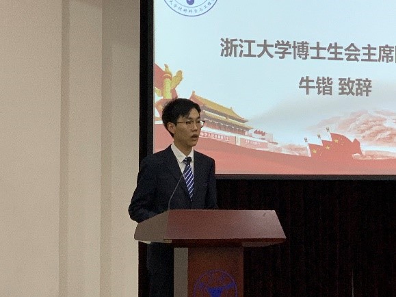 浙江大学博士生会主席团成员牛锴致辞,他表达了对材料学院第二次研究生代表大会召开的热烈祝贺以及对材料学院研博会一年以来的工作成果的认可,同时也针对几点不足提出了建议,希望研博会能进一步整合学院内外资源,凝聚学生力量,不断在传承中谋创新,在变革中求发展,创造更加出色的成绩!