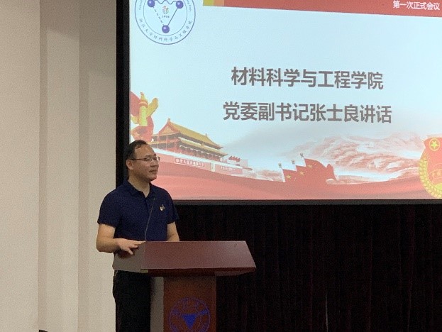 材料科学与工程学院党委副书记张士良老师发表讲话,他充分肯定了材料学院研博会在带领全院师生员工积极参与校院建设中的突出业绩,以及在思想政治建设、学院学风营造、职业生涯发展、学生权益服务方面取得的成绩。同时,他对新一届研博会的主席团提出明确职责、服务同学,严于律已、素质过硬的要求,也向材料学院所有同学提出几点希望:一是立志高远,胸怀人民;二是脚踏实地,谦虚学习;三是直面挫折,永不言败。