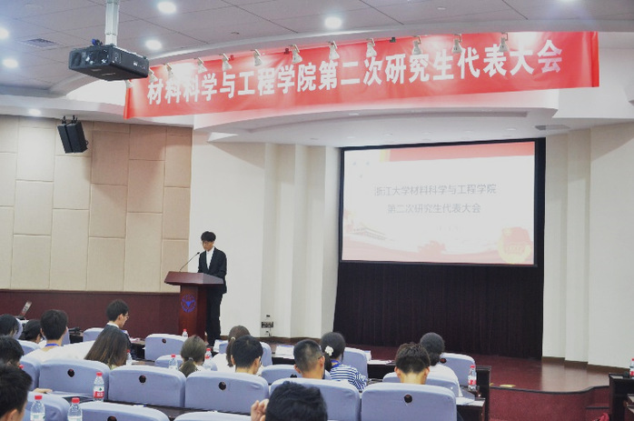 材料科学与工程学院党委副书记张士良老师、材料科学与工程学院团委书记李由老师、浙江大学博士生会主席团成员牛锴同学、高分子科学与工程学系研究生会执行主席盛秋月同学和化学系研究生会执行主席陈维伟同学出席了本次大会,共同参会的还有由材料学院各研究生团支部推选的代表所组成的七个代表团。大会由郭瑞泽同学主持。