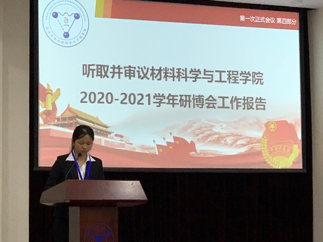 随后,全体代表听取并审议了姚悦作的2020-2021学年研博会工作报告。她回顾和总结过去一年的工作,材料学院研博会积极开展有关学术交流、求职就业、文化活动、体育赛事、对外宣传、对内改革等工作,切实服务师生的工作和生活,但在工作传承性、团队凝聚力、品牌影响力等方面仍存在努力空间,希望新一届的研博会成员能继承发扬研博会优良传统,改进完善研博会的组织建设和活动策划。