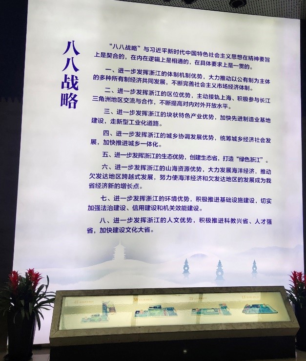 2021年11月6日8:30,同学们从玉泉校区正大门集合前往杭州市城市规划馆,一进入展馆,八八战略映入眼帘,“八八战略”是习近平于2003年7月中共浙江省委举行第十一届四次全体(扩大)会议提出的面向未来发展的八项举措,即进一步发挥浙江省八个方面的优势、推进八个方面的举措。