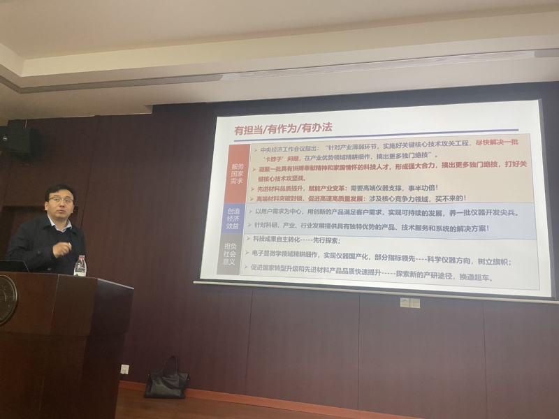 随后,师生们来到桐庐科技孵化园,前往浙江大学电子显微镜中心桐庐分部调研学习,由张跃飞教授作关于“产业新兴领域的研究发展现状”及“未来电镜的发展路线”等内容的报告。张教授强调做科研要面向国家重大需求,使科研的意义得到更大的彰显和发挥,这是每一位科研人义不容辞的责任。除此之外,张教授还勉励大家要坚定理想信念,厚植家国情怀,将来与我国千千万万志同道合的科研人一起,为进军“卡脖子”领域攻坚克难,为国家富强、民族振兴、人民幸福贡献力量。