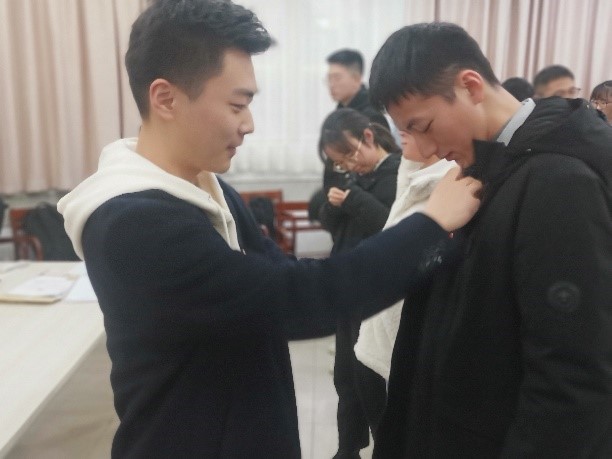 支部书记万士齐对新发展的五位同志表示热烈欢迎,并为他们佩戴党徽。鼓励全体支部同志共同进步,把学业科研放在首要位置,同时积极投身于支部建设,并积极影响团组织内的同学,真正做到党支部引领团支部,充分发挥先锋模范作用。
