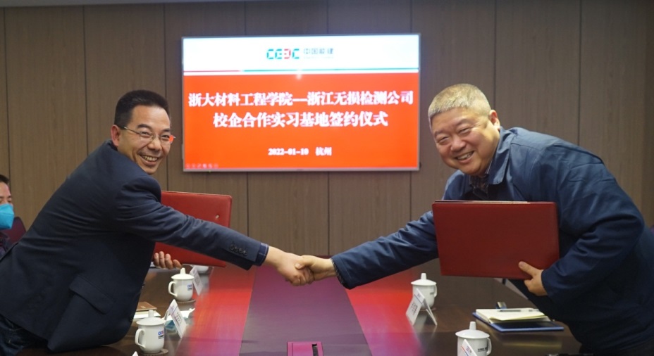 2022年1月10日,通过前期工作及努力,材料学院本科生校外教学实习基地在中国能源建设集团浙江火电建设有限公司挂牌,学院副院长程逵教授、本科教学实验中心刘芙研究员、卢洋藩老师一行赴浙江火电无损检测萧山基地参加签约揭牌仪式。浙江火电公司党委副书记、工会主席严永禾,无损检测公司总经理董吉原,无损检测公司副总经理郭国均,火电公司人力资源部主任蒋明朝,办公室副主任许云伟等领导班子成员共同参加基地签约揭牌仪式。