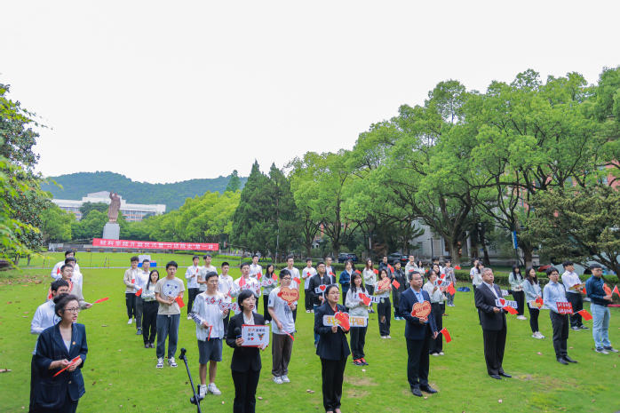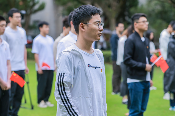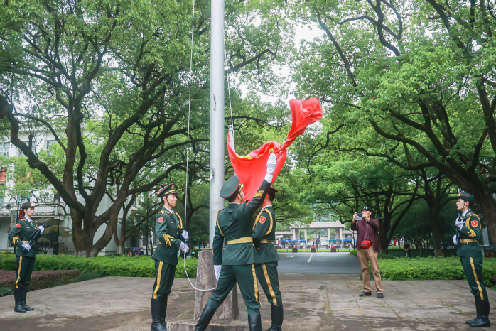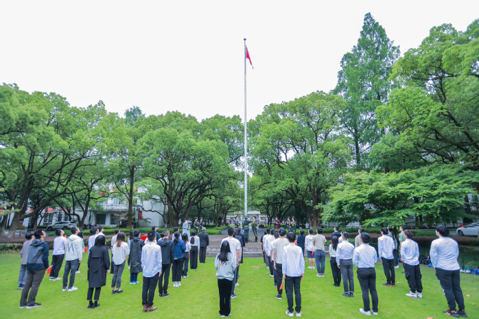 630分,升旗仪式准时开始。浙大学生国旗仪仗队队员们精神抖擞,迈着整齐的步伐,将五星红旗护送至旗杆下。材料师生们注视着五星红旗在庄严的国歌声中冉冉升起,饱含对伟大祖国的真挚祝福。