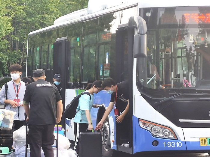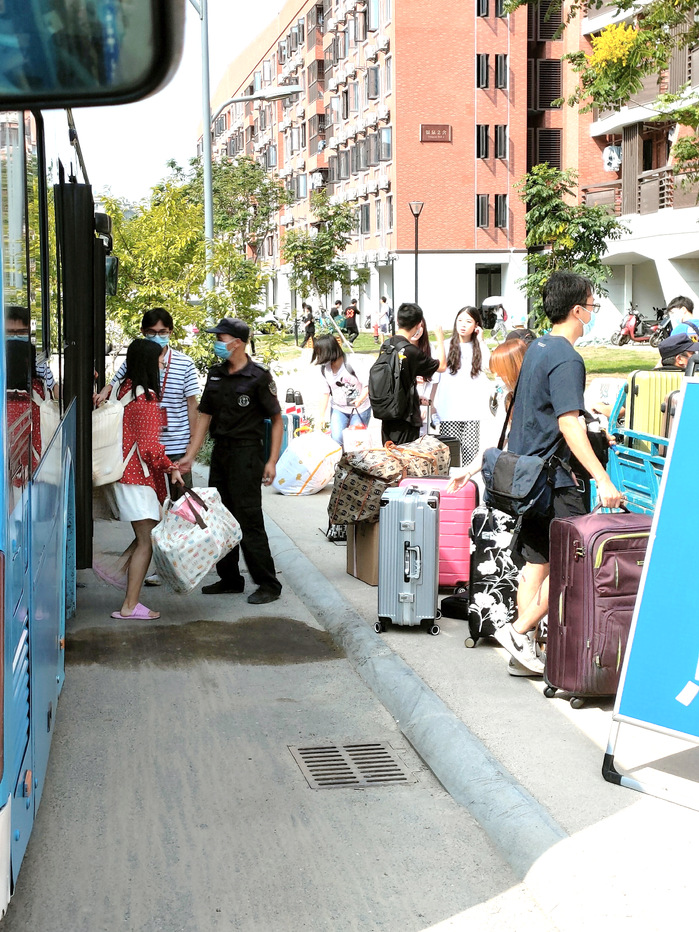 坐上接驳车的身影里,不乏有许多娇小的身躯,她们带着沉重的生活必需品到离家甚远的浙大求学,在路途奔波中显然有些吃力。可我们支部的同学哪里忍心她们受这样的委屈,刘硕同志等人站在接驳车上帮助同学们搬运行李,播报站点,有序引导同学们在相应的宿舍楼区域下车,他们有力的臂膀托举起一件件行李,更是托住了一段段陌生但分外亲切的同学情,骄阳似火,我们甘之如饴。