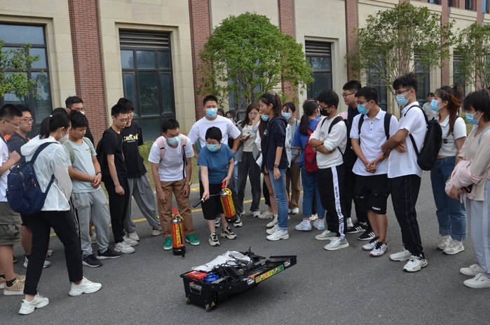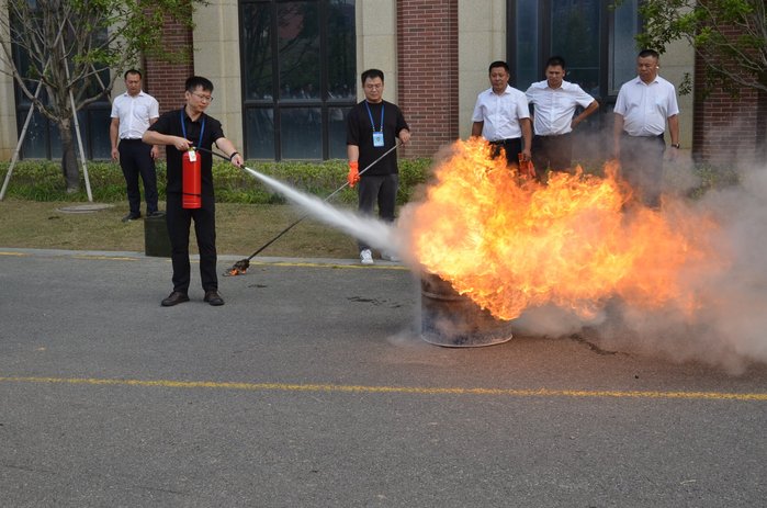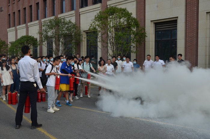 接下来,安保处防火办主任顾冬健向同学们详细介绍了干粉灭火器“一提二拔三压”的使用方法,随后,大家依次进行实操体验,根据老师指导,顺利完成灭火任务。
