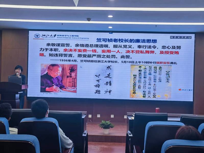 在报告的最后,王老师告诫同学们要“要扣好人生的第一粒扣子”,树立正确的价值取向,带领同学们重温竺可桢老校长“知先后、明公私,辩是非”的廉洁思想,传递了“心存敬畏,守牢底线”“独立思考,不断学习”“坚持攀登,敢于挑战”“合作共赢,共同发展”“健康快乐,生活幸福”五大寄语。