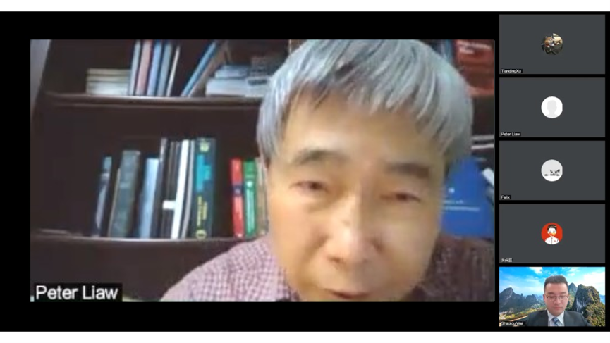 在大会主旨报告环节,来自美国田纳西大学材料科学与工程学院Peter Liaw院士给大家带来“An Introduction and High-throughput Design of High-performance Lightweight High-entropy Alloys”的主题报告,他在线播放高熵合金提出者台湾清华大学叶均蔚教授创作的“高熵合金之歌”作为序曲,用深入浅出的语言回顾了高熵合金材料近20年来的发展历程,包括高熵合金的起源、特点和性能等。最后以铝-铬-铁-锰-钛体系为例,讲述了基于calphad高通量计算方法,有效地寻找到由共格的BCC和L21相组成的轻质高熵合金成分,为发现和设计高强度、低密度和低成本的轻质高熵合金材料指明方向。他指出,未来关于高熵合金基本的理论研究依然是必要的,比如扩散问题,为在场的博士生提供了一个清晰的研究方向。北京科技大学张勇教授简要地介绍了我国这些年来在高熵合金材料领域取得科研成绩,指出熵的概念已经被用来作为一种有效的策略来开发新材料,以打破现有材料的性能记录。例如,打破合金高强度和高塑性之间的权衡。对于结构材料,尤其在复杂的情况下,需要多种性能的平衡,比如磁性材料通常表现出优异的磁性,但机械性能和耐腐蚀性能较弱;高熵合金的自愈效应可能使其具有较高的抗辐照性能,而钨基高熵合金的自锐化行为又主要和其锯齿形行为密切相关。“鱼和熊掌不可兼得”,在科研中同样渗透着人生的哲理,勉励博士研究生们在生活中要学会善于取舍。韩国浦项工大的Hyoung Seop Kim院士作了题为“Sheet formability of high-entropy alloys”的大会报告,介绍了韩国在高熵合金材料方面的研究成果,重点是对高熵合金成形性能的评价。发现和304不锈钢以及TWIP钢相比,钴铬铁锰镍高熵合金具有较低的裂纹萌生率和良好的成形特性。“产学研”相结合,学以致用是Kim教授教给参会博士研究生们留下的最深印象。科研工作者不仅要考虑学术问题,还要推动产业化,让科研成果真正走向老百姓的生活。