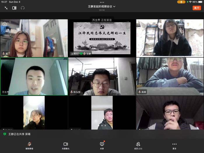 11月30日下午,敬爱的江泽民同志逝世的噩耗传来,大江南北、长城内外,中华大地笼罩在巨大的悲痛之中。2022年12月6日下午15:00,材料科学与工程学院本科生第二党支部召开了以“江泽民同志伟大光辉的一生”为主题的党日活动。会上,由王静同志向大家介绍了江泽民同志的生平事迹,万士齐同志也向同志们介绍了江泽民同志与浙大四校合并的渊源。大家一致表示,要化悲痛为力量,继承江泽民同志的遗志,更加自觉地团结在以习近平同志为核心的党中央周围,为全面建设社会主义现代化国家、全面推进中华民族伟大复兴而团结奋斗。