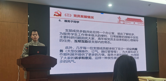 会上,20名研究生和本科生党支部书记,先后围绕教育党员、管理党员、监督党员、组织学生、宣传学生、凝聚学生、服务学生等方面轮流述职,总结本年度工作亮点,查找问题不足,明确前进方向。复材所研究生党支部充分发挥以所为整体的支部优势,将党建与业务深度融合,在党建中强业务,在业务中促党建。本科生第一党支部有力突出支部特色,与各支部开展深入合作,在宣传层面不断提高支部的影响力。材物所研究生第一党支部将团支部书记纳入党建工作小组,每次党建活动都邀请团员参与,有效推动了党团工作互促互进。参会评委对各党支部的述职报告进行了逐一点评,在肯定支部工作的同时结合各支部特点给出了针对性建议。